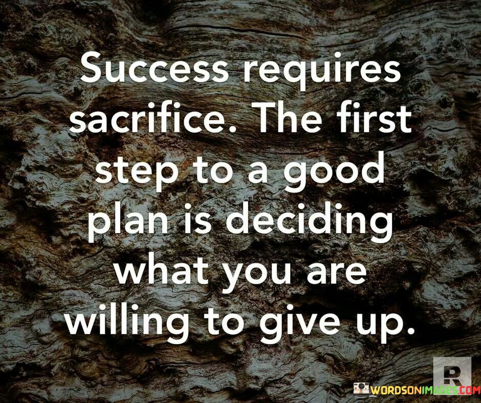 The statement "Success requires sacrifice. The first step to a good plan is deciding what you are willing to give up" succinctly conveys the idea that achievement often demands letting go of certain things. In this context, the first paragraph emphasizes that meaningful success involves trade-offs.