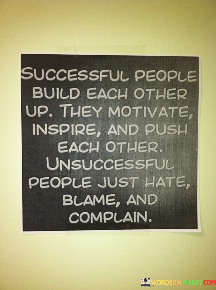 The phrase "Successful people build each other up; they motivate, inspire, and push each other. Unsuccessful people just hate, blame, and complain" succinctly contrasts the supportive and collaborative nature of success-oriented individuals with the negative attitudes of those who are less successful.