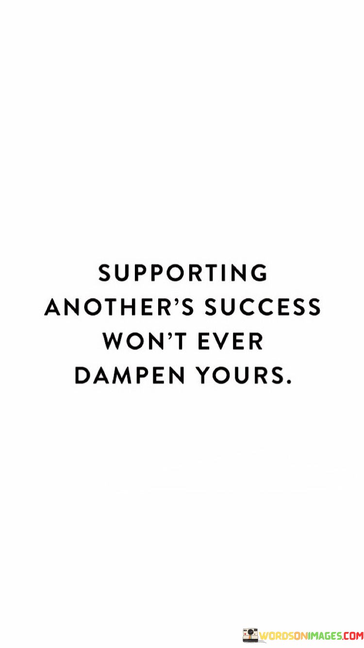The phrase "Supporting Another's Success Won't Ever Dampen Yours" underscores the idea that celebrating and aiding the achievements of others does not diminish one's own potential for success.