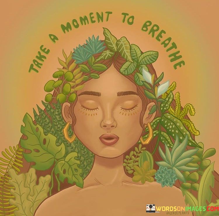 Amid life's hustle, this quote encourages pausing for a breath. It's like a gentle reminder to find tranquility in the chaos. Taking a moment to breathe means stepping back, allowing yourself a break from the rush. It's a small pause that can bring clarity and peace.