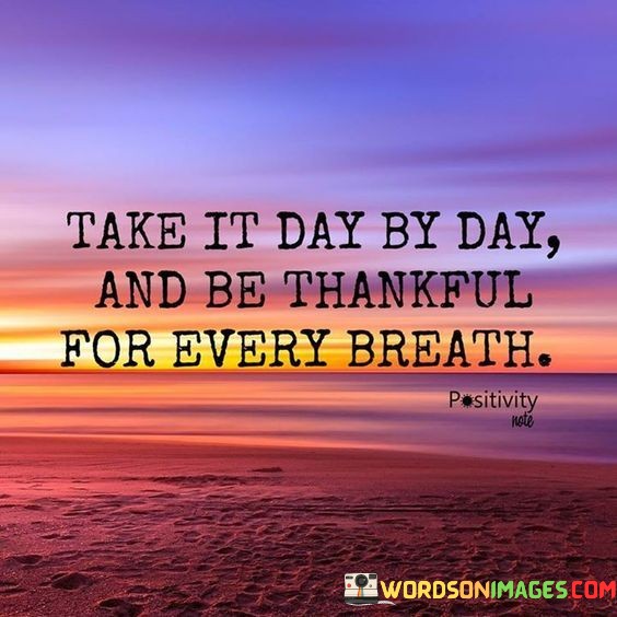 The advice advocates a mindful approach to life. It suggests focusing on each day as it comes and finding gratitude in the simplest moments, such as breathing. By taking life step by step, one can appreciate the present and cultivate a positive perspective, fostering a sense of thankfulness for every breath and the experiences it brings.