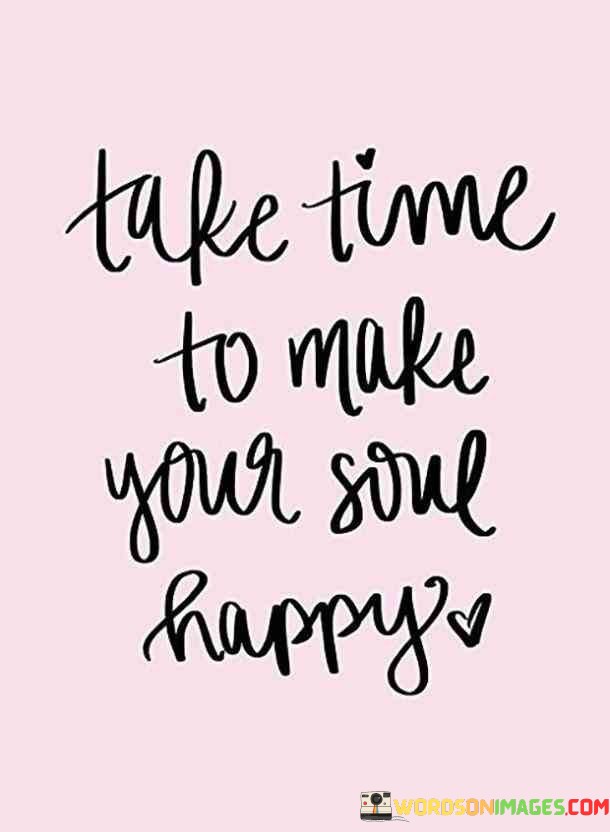 The quote advocates self-awareness. "Take Time To Make Your Soul Happy" encourages reflection on personal needs and desires. Allocating time for soul-enriching experiences nurtures a positive mindset, empowering individuals to navigate challenges with greater resilience and cultivating a fulfilling, meaningful existence.