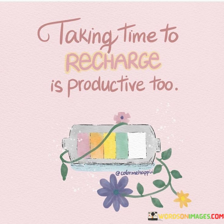 The statement challenges the notion of constant busyness. "Taking Time To Recharge" implies self-awareness. "Is Productive Too" encourages individuals to recognize that rest contributes to increased efficiency and creativity.