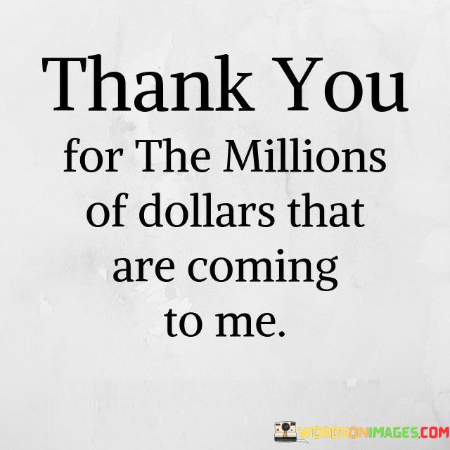 Expressing gratitude for future wealth is a positive affirmation that aligns with the concept of manifestation and the law of attraction. By thanking in advance for the millions of dollars that are anticipated, this statement reflects a belief in attracting abundance.