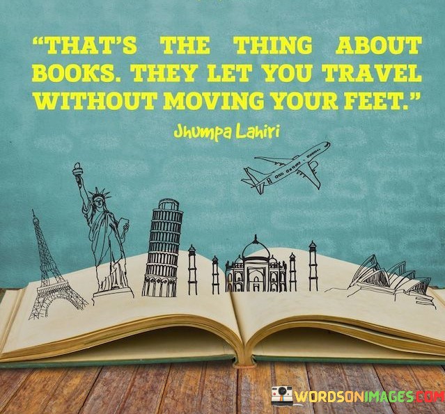 The quote captures the essence of literary escapism. "That's The Thing About Books" emphasizes their magic. "They Let You Travel Without Moving Your Feet" illustrates the ability to explore places, eras, and perspectives from the comfort of one's surroundings.
