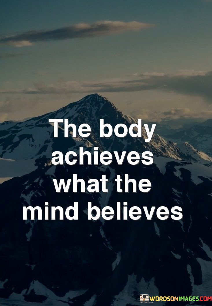 Imagine you're trying to ride a bike. "The body achieves what the mind believes" is like saying if you believe you can balance, your body will try harder to stay up.