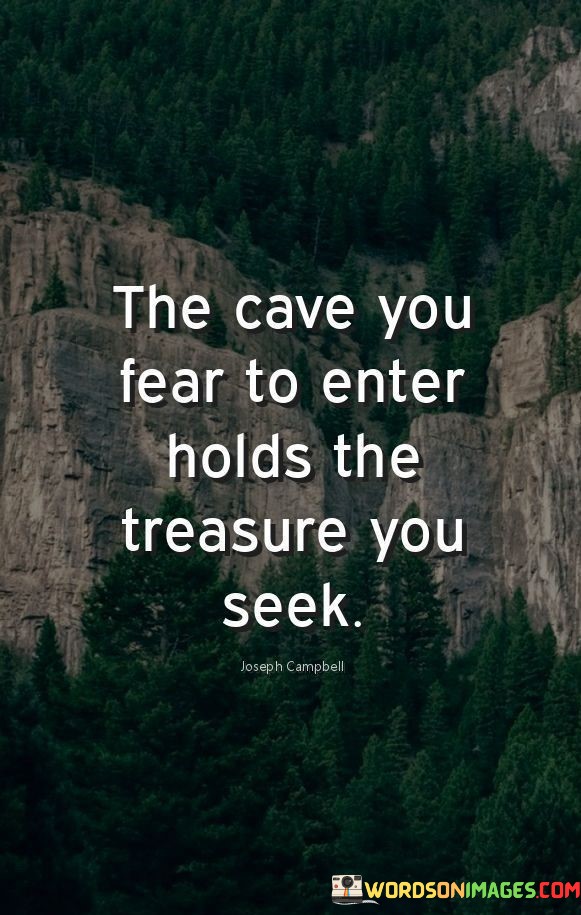 The quote embodies the idea that confronting fears leads to hidden rewards. The metaphorical "cave" represents challenges avoided due to fear. The quote suggests that the very obstacles we fear harbor the desired rewards. It urges embracing discomfort to access the treasures of personal growth, knowledge, and fulfillment residing within challenges.
