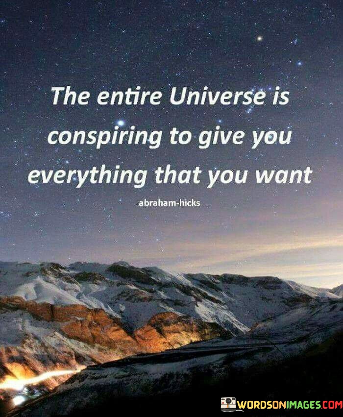 It signifies a sense of cosmic harmony. The phrase suggests that the universe is actively working to bring about the fulfillment of an individual's desires. It reflects a perspective that emphasizes synchronicity and positivity.