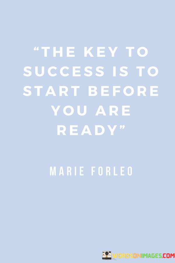 The statement "The Key to Success Is to Start Before You're Ready" underscores the notion that taking initiative and beginning a task or endeavor, even if one feels unprepared, is crucial for achieving success.