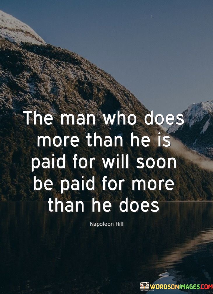 The quote "The man who does more than he is paid for will soon be paid more than he does" highlights the principle of going above and beyond in one's efforts and contributions. It emphasizes the value of adding extra value and effort to one's work, which eventually leads to greater recognition, rewards, and opportunities for advancement. By doing more than what is expected or required, an individual demonstrates initiative, dedication, and a strong work ethic. Employers and colleagues take notice of such individuals who consistently go the extra mile to deliver exceptional results. This heightened level of dedication and commitment sets them apart from their peers and positions them for future opportunities. Moreover, the quote underscores the idea that rewards and recognition often follow those who are willing to exceed expectations. When someone consistently provides exceptional service or performance, it not only benefits their organization but also contributes to their personal growth and professional reputation. This enhanced reputation and track record of excellence create a demand for their skills, leading to potential promotions, raises, or new opportunities with higher remuneration.