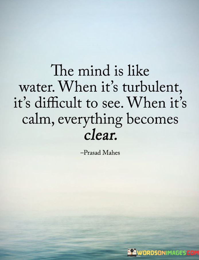 The quote, "The mind is like water. When it's turbulent, it's difficult to see. When it's calm, everything becomes clear," draws a powerful analogy between the state of the mind and the nature of water. The quote suggests that the mind, like water, experiences fluctuations in its clarity and ability to perceive depending on its state. When the mind is agitated, restless, or filled with negative emotions, it becomes turbulent, clouding our judgment and hindering our ability to think clearly. In such a state, our thoughts may be scattered, and decision-making can be challenging. On the other hand, when the mind is serene and tranquil, like calm water, our thoughts become focused, and our perceptions sharpen. In a state of mental calmness, we gain clarity, insight, and a deeper understanding of ourselves and the world around us. The quote encourages us to cultivate mental calmness through practices like mindfulness and meditation, recognizing that a serene mind enables us to navigate life's challenges with clarity, wisdom, and a greater sense of peace. At its core, the quote celebrates the transformative power of cultivating a calm and composed mind. Just as turbulent water distorts reflections and makes it difficult to see clearly, a restless mind can obstruct our ability to make sound judgments and perceive situations objectively. In times of stress, anxiety, or emotional turmoil, our thoughts may become jumbled, and we may struggle to find clarity amidst the chaos. Moreover, the quote speaks to the importance of self-awareness and emotional intelligence in managing our mental state. By recognizing when our minds are becoming turbulent, we can take proactive steps to address the underlying causes of stress or negative emotions. Engaging in practices like meditation, mindfulness, or other relaxation techniques can help us achieve a state of mental calmness and restore clarity to our thoughts. Furthermore, the quote underscores the value of clarity and focus in decision-making and problem-solving. When our minds are calm, our thoughts become more organized, and we can approach challenges with greater objectivity and insight. This mental clarity allows us to assess situations more effectively, consider various perspectives, and make informed choices that align with our values and goals. In conclusion, the quote "The mind is like water. When it's turbulent, it's difficult to see. When it's calm, everything becomes clear" draws a compelling analogy between the state of the mind and the nature of water. It encourages us to cultivate mental calmness through practices like mindfulness and meditation, recognizing that a serene mind enables us to navigate life's challenges with clarity, wisdom, and a greater sense of peace. By nurturing a calm and composed mind, we can find clarity amidst the turbulence of life, make sound judgments, and gain deeper insights into ourselves and the world around us. This quote serves as a powerful reminder of the transformative power of a serene mind, urging us to embrace practices that promote mental calmness and clarity to enhance our overall well-being and navigate life with greater wisdom and purpose.