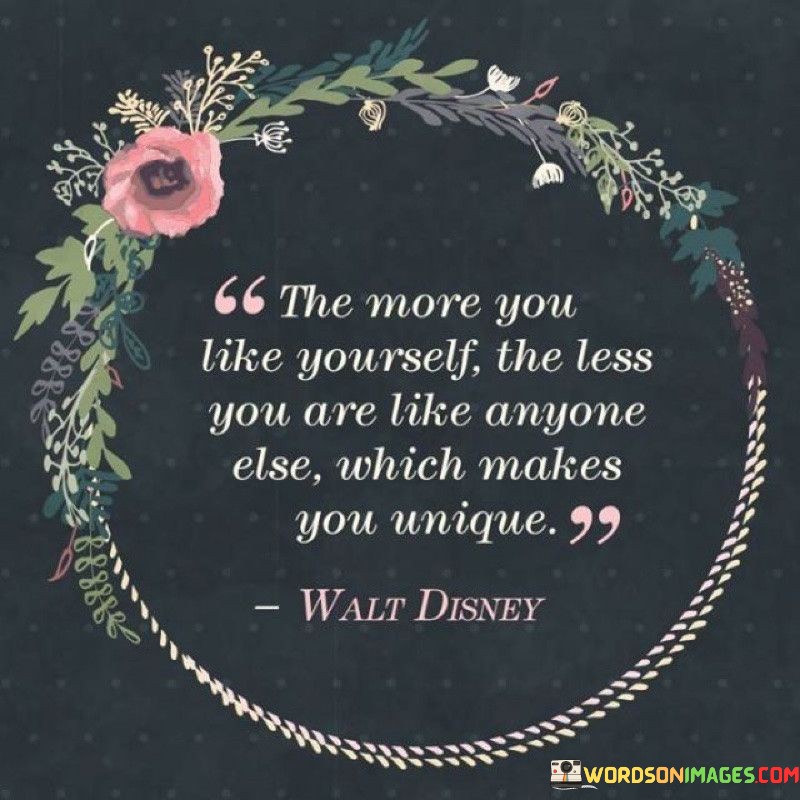 This quote highlights the connection between self-acceptance and individual uniqueness. It suggests that as one's self-esteem and self-liking increase, their inclination to conform to others' standards or opinions decreases, allowing their unique qualities to shine through.