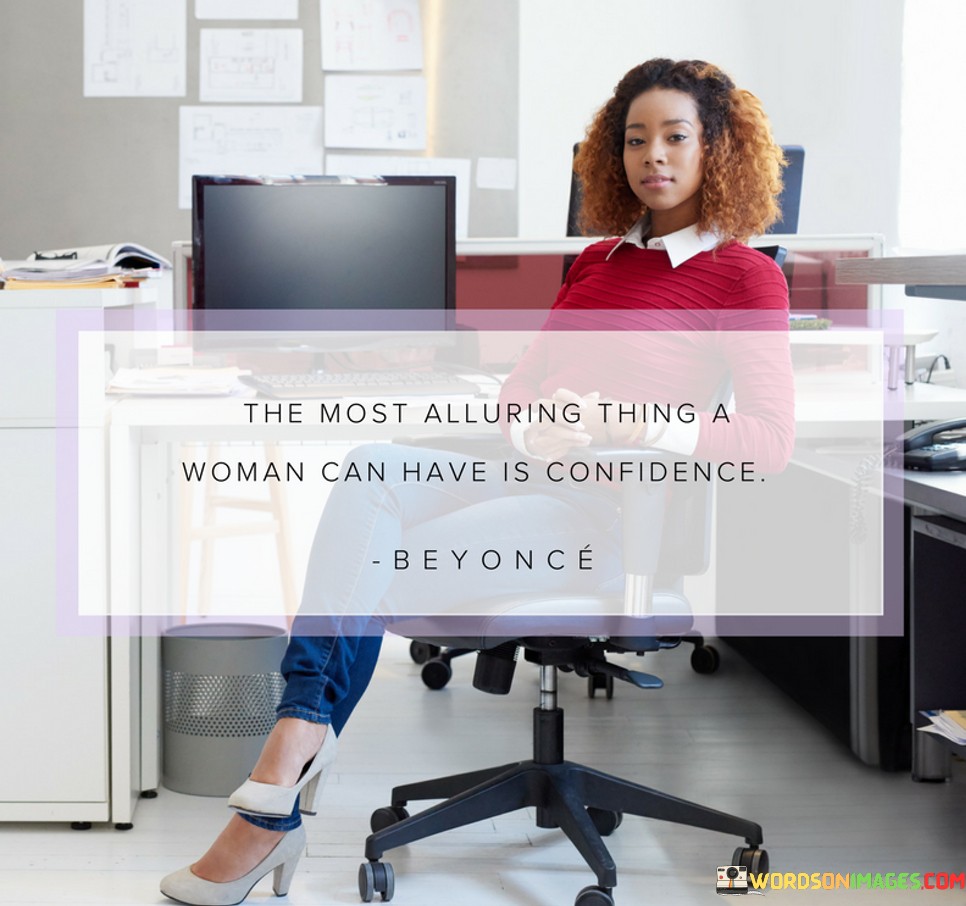 This quote celebrates the power and allure of confidence in women. It asserts that confidence is the most captivating and attractive quality a woman can possess. The phrase "the most alluring thing a woman can have" emphasizes that confidence transcends physical appearance or material possessions, becoming the defining trait that draws others in and leaves a lasting impression. Confidence exudes an air of self-assurance and inner strength, radiating from within and captivating those around her. It serves as a magnet, drawing people toward her, not just for her looks but for the magnetic energy she exudes. Confidence empowers women to embrace their true selves, celebrating their uniqueness and imperfections, and projecting a sense of self-assuredness that captivates and inspires others. Ultimately, the quote sends a powerful message, celebrating the beauty and appeal of confidence as a transformative and magnetic quality that transcends external appearances and leaves a lasting impact on those fortunate enough to encounter it.This quote speaks to the undeniable allure and power of confidence in women. It emphasizes that confidence is the most captivating and attractive quality a woman can possess, surpassing physical beauty or material possessions. The phrase "the most alluring thing a woman can have" underscores the transformative nature of confidence, which transcends surface-level attractiveness and draws people in with its magnetic energy. Confidence exudes a sense of self-assurance and inner strength that radiates from within, leaving a lasting impression on those who encounter it. It becomes a magnet, drawing others toward the woman exuding this quality, not just for her looks, but for the empowering aura she carries. Confidence empowers women to embrace their true selves, celebrating their uniqueness and imperfections, and projecting a sense of self-assuredness that captivates and inspires others. The quote serves as a reminder of the profound impact of confidence, which has the ability to transform and elevate a woman's presence and allure, making her a magnetic force that leaves a lasting impact on everyone she encounters. It celebrates the beauty of embracing one's authenticity and self-assurance, encouraging women to exude confidence as the most alluring and captivating quality they can possess.