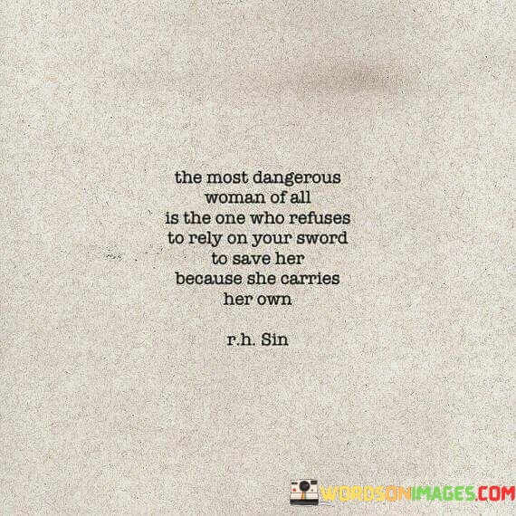This powerful quote portrays a woman who defies traditional gender roles and expectations by embodying true independence and strength. It describes her as "The Most Dangerous Woman Of All" not because she poses a threat to others, but because she challenges the conventional notion of vulnerability and the need for external protection. The phrase "who refuses to rely on your sword to save her" symbolizes her rejection of the idea that she needs someone else, particularly a man, to rescue or defend her. Instead, she stands firmly on her own two feet, ready to face the world with courage and determination, irrespective of the challenges that come her way. The quote emphasizes that she "carries her own" sword, which represents her ability to protect herself, make her own decisions, and carve her path in life.