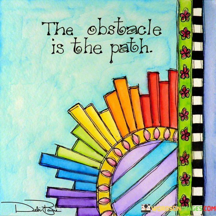 The quote "The obstacle is the path" reframes challenges as opportunities for growth. It suggests that instead of avoiding obstacles, embracing them can lead to personal development and transformation, highlighting the idea that difficulties are integral to the journey towards success.