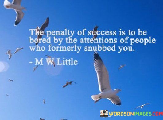 The quote captures the irony of success by highlighting its downside. Achieving success can lead to a shift in how others perceive and treat you. People who once disregarded you might suddenly seek your attention. However, this attention, born out of convenience, can become tiresome and hollow, causing a sense of detachment and boredom.