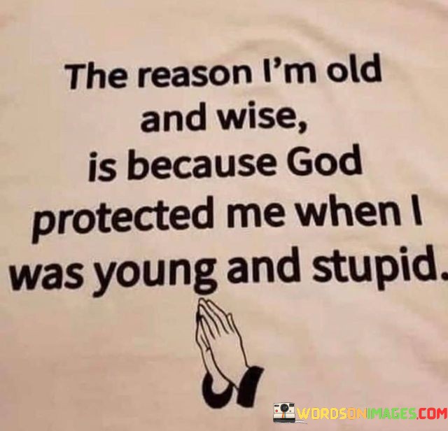 This quote humorously reflects on the concept of growing older and wiser. It suggests that the wisdom that comes with age is partly attributed to God's protection during one's younger, more impulsive years.