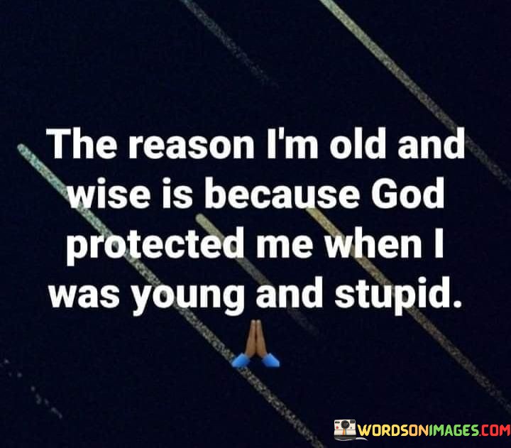 This quote humorously reflects on the wisdom that comes with age, attributing it to divine protection during one's youthful, and perhaps less prudent, years. It suggests that God's guidance and safeguarding played a crucial role in helping the individual survive their youthful mistakes.