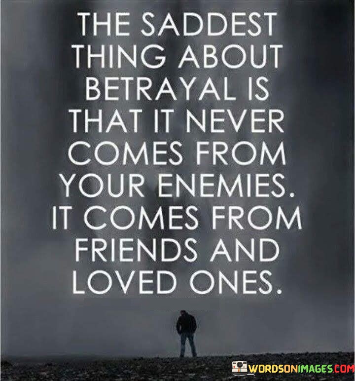 The quote delves into the emotional impact of betrayal. "Saddest thing about betrayal" highlights the emotional gravity. "Never comes from your enemies" implies unexpected sources. "Comes from friends and loved ones" signifies the depth of hurt, as betrayal often occurs within trusted relationships.