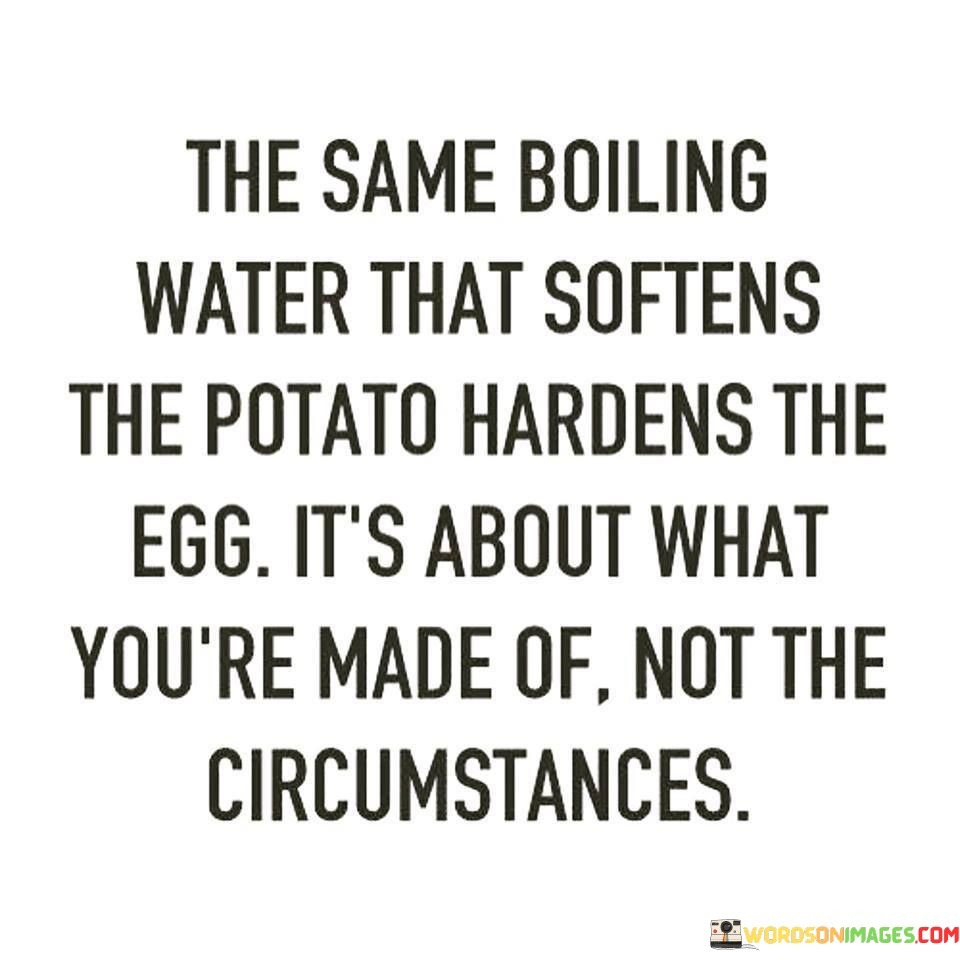 This quote draws a powerful analogy between the reactions of a potato and an egg when exposed to boiling water. It suggests that the outcome is determined not by the external circumstances (the boiling water) but by the intrinsic nature of the object (the potato or egg).