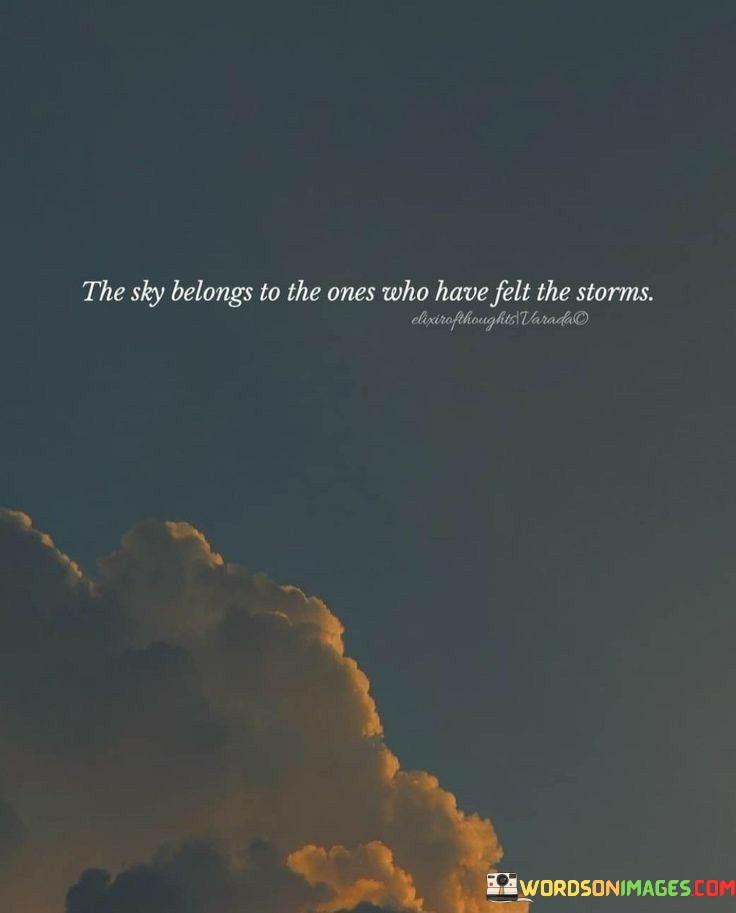 The quote "the sky belongs to the ones who have felt the storms" speaks to resilience and triumph over challenges. It suggests that those who have endured difficulties and overcome adversity hold a unique claim to the rewards of success and freedom.