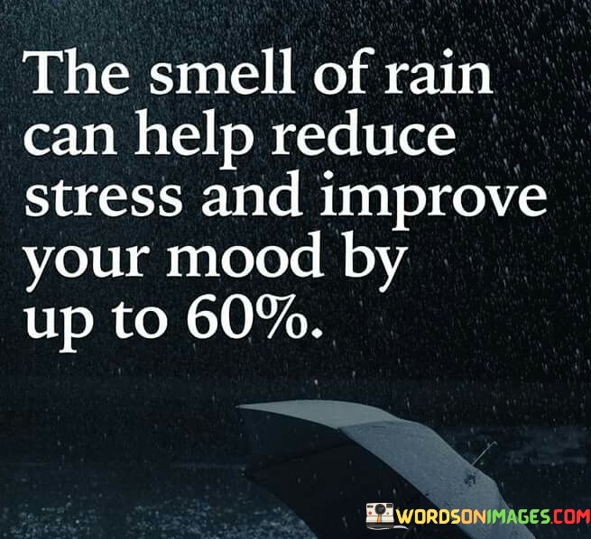This quote highlights the remarkable impact that sensory experiences can have on our well-being. "The smell of rain" denotes a specific sensory stimulus, the earthy and fresh aroma that follows rainfall. The claim that it can reduce stress and improve mood by up to 60% underscores the potential for nature's scents to influence our mental and emotional states positively.