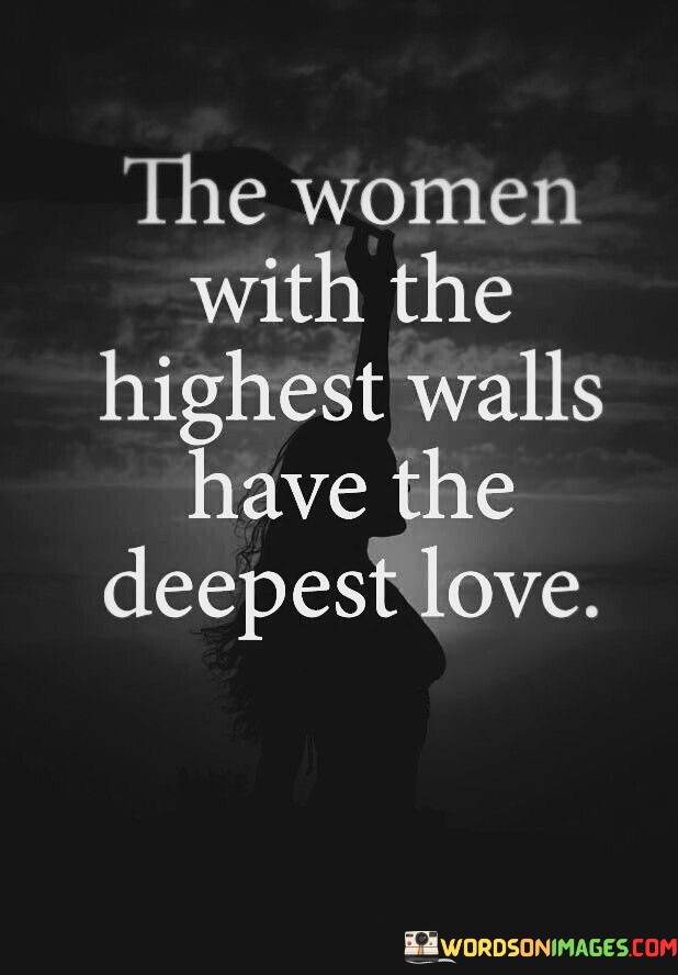 This quote delves into the paradoxical nature of love and emotional barriers, suggesting that women who appear guarded or distant on the surface may actually possess the capacity for profound and intense love. The phrase "the women with the highest walls" refers to individuals who have built emotional defenses, possibly due to past hurts or traumas. These walls may manifest as guardedness, hesitancy, or reluctance to open up fully to others. However, the quote asserts that beneath these protective layers lies "the deepest love," indicating that these women have the ability to love intensely and passionately once they allow someone to breach their defenses. It speaks to the resilience and depth of their emotions, suggesting that their guardedness is a reflection of their sensitivity and capacity to feel deeply. Ultimately, the quote challenges the assumption that vulnerability equates to weakness, highlighting the strength and profound emotional connection that can arise when someone gains the trust and love of a woman who has guarded her heart.This quote sheds light on the complexities of love and emotional vulnerability, suggesting that women who appear guarded or distant may harbor the capacity for the most profound and intense love. The phrase "the women with the highest walls" refers to individuals who have built emotional defenses, potentially as a response to past hurts or traumas. These walls may manifest as guardedness or hesitancy in forming deep connections with others. However, the quote asserts that beneath these protective layers lies "the deepest love," indicating that these women possess a wellspring of profound emotions and affection. It suggests that their guardedness is not a sign of an inability to love but rather a reflection of their sensitivity and capacity to feel deeply. By highlighting the strength and resilience of these women, the quote challenges the assumption that vulnerability equates to weakness. Instead, it celebrates the power and depth of their emotional connection, suggesting that once someone gains the trust and love of a woman who has guarded her heart, they are likely to experience a love that is boundless, passionate, and transformative. The quote serves as a reminder of the beauty and complexity of human emotions, encouraging us to approach relationships with empathy, understanding, and an appreciation for the profound love that can blossom when emotional barriers are overcome.