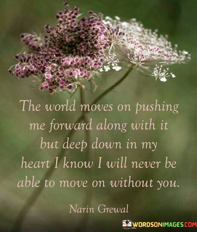 The quote reflects the conflict between external movement and internal emotions. "World moves on" conveys progress. "Deep down in my heart" signifies internal struggle. "Never be able to move on without you" conveys emotional attachment and difficulty moving forward.