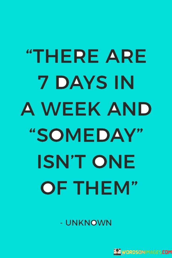 Many people often use the word "someday" as a way to put off doing things they want to do or achieving their goals. They may have dreams and ambitions but keep postponing taking the necessary steps to make them a reality. However, as the quote suggests, "someday" is not a day of the week; it is not a tangible moment in time. It is merely a vague notion that provides a false sense of comfort without any concrete plan or action attached to it.