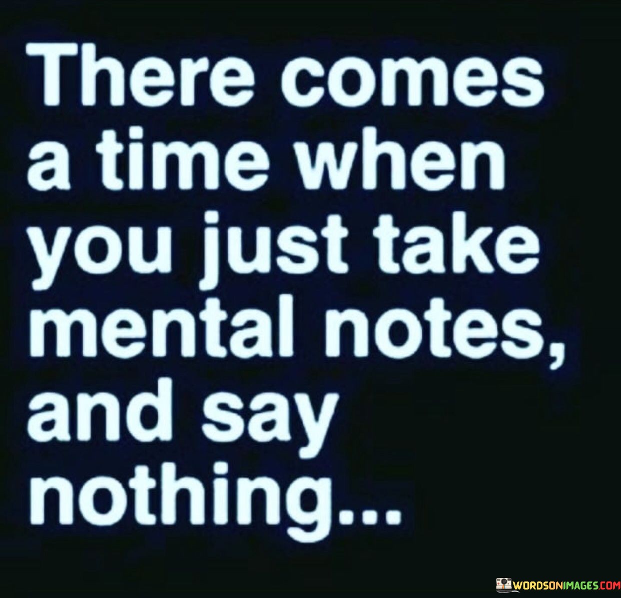 The quote underscores the importance of thoughtful observation. It suggests a moment of choosing silence to process information or emotions. "Mental notes" reflect the gathering of insights and understanding through observation and contemplation.