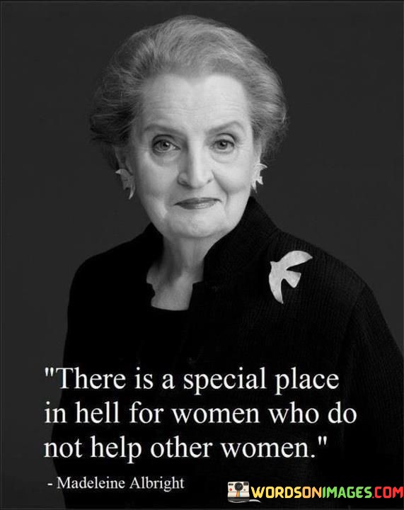 The quote "There is a special place in hell for women who do not help other women" is a call to action for women to support and empower each other. It suggests that women who do not support other women will face consequences in the afterlife, emphasizing the importance of female solidarity and the consequences of failing to support other women. The quote highlights the fact that women are often marginalized in society and experience unique challenges. Women face discrimination and inequality in many areas of life, from the workplace to healthcare. These challenges can be exacerbated by the lack of support from other women, who may be competing for the same opportunities or resources. The quote suggests that women who do not help other women are contributing to the marginalization of women as a whole. Despite these criticisms, the quote remains a powerful reminder of the importance of female solidarity. It highlights the fact that women have the power to lift each other up and create positive change in the world. By supporting other women, women can create a community of empowerment and strength that can help them overcome the challenges they face. In this way, the quote serves as a call to action for women to support and empower each other, and to work together to create a better world for all women.