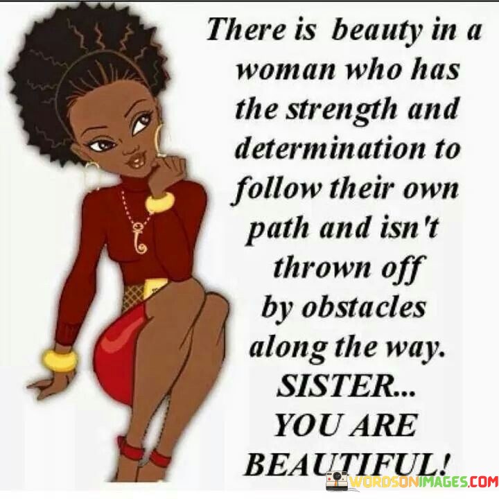 This quote praises the beauty found in a woman who possesses the courage, strength, and unwavering determination to carve her own path in life, undeterred by the challenges that may come her way. It celebrates the unique allure of a woman who refuses to be swayed or discouraged by obstacles, confidently embracing her individuality and pursuing her dreams. The quote addresses the woman as "sister," acknowledging the sense of sisterhood and camaraderie among women who support and uplift each other. It serves as an uplifting message to all women, reminding them of their inherent beauty when they dare to be true to themselves and forge ahead in the face of adversity.The quote celebrates the inner strength and resilience of women who choose to chart their own course in life, guided by their passions and aspirations. These women exude beauty through their confidence, as they fearlessly confront challenges and continue moving forward despite the hurdles. The use of the term "sister" fosters a sense of unity among women, recognizing the power of sisterhood in uplifting and empowering each other. The message encourages women to celebrate their unique journeys and not be deterred by societal expectations or obstacles. By embracing their authentic selves and staying true to their ambitions, they radiate a beauty that goes beyond mere physical appearance. This quote serves as a reminder to all women that their strength, determination, and resilience make them truly beautiful, and that supporting and uplifting one another is an integral part of the journey towards self-discovery and empowerment.