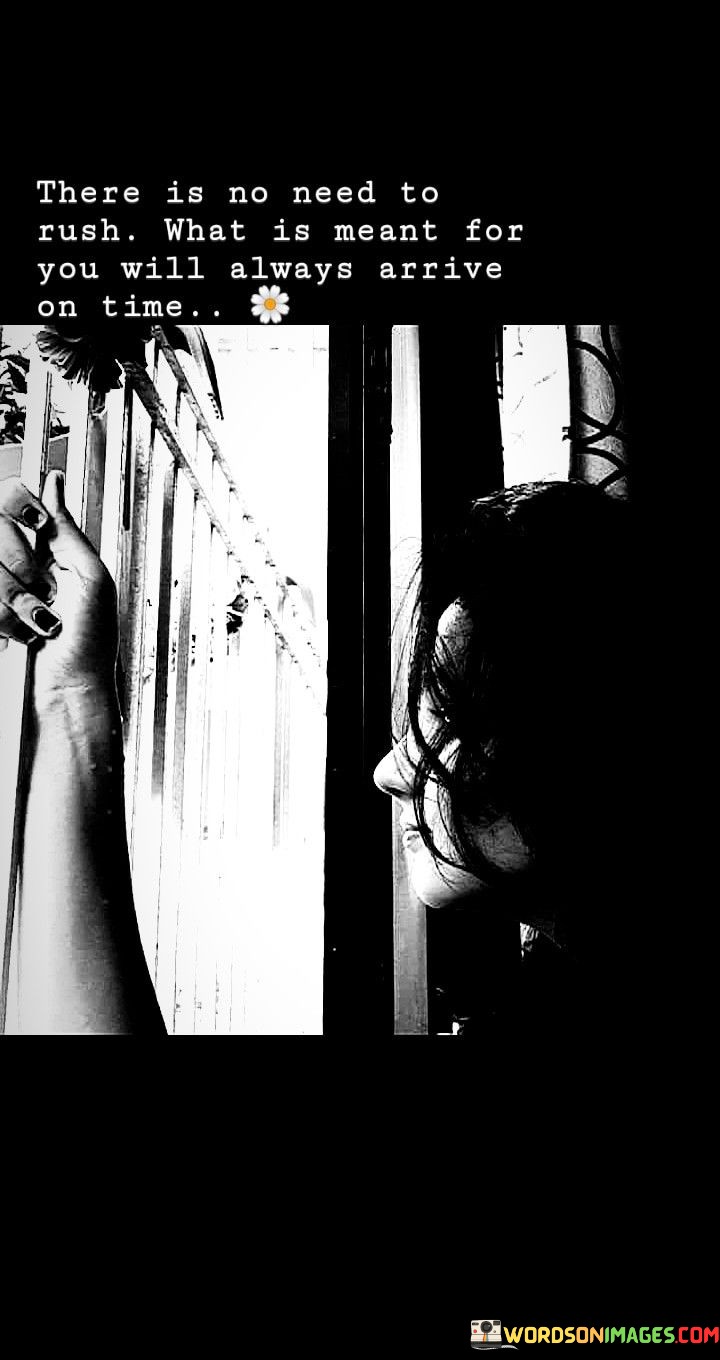 The quote "There is no need to rush; what is meant for you will always arrive on time" conveys the idea of patience and trust in the timing of life's events. It suggests that forcing outcomes or rushing can hinder natural progress. This perspective encourages individuals to embrace the journey and have faith in the unfolding of destiny.