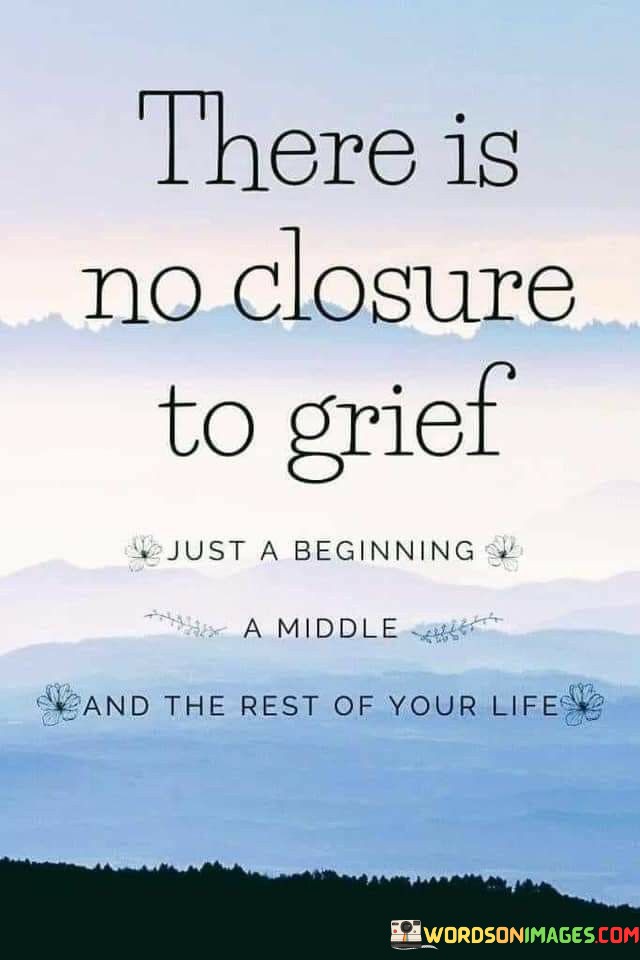 The quote reflects the ongoing nature of grief. "No closure to grief" conveys its lasting impact. "Beginning, middle, and rest of your life" symbolizes the journey of healing. The quote conveys that grief evolves over time but never truly closes.