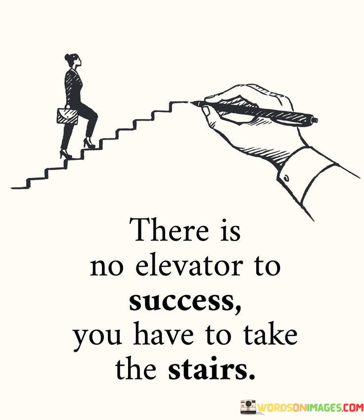 In the first paragraph, this quote highlights that success is not an easy, instantaneous journey. It suggests that there are no shortcuts or quick fixes to reach one's goals. Instead, individuals must be willing to put in the hard work, take each step, and make steady progress over time.