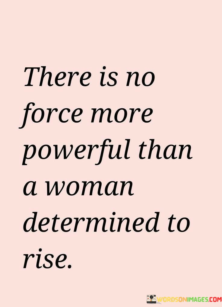 This impactful quote celebrates the indomitable spirit and strength of women who possess unwavering determination to overcome challenges and achieve greatness. It emphasizes that there is no force in the world more potent than a woman who is committed to rising above adversity and realizing her full potential. The phrase "determined to rise" encapsulates the resilience and drive within these women, signifying their refusal to be held back by obstacles, stereotypes, or societal limitations. It speaks to the power of ambition and self-belief, illustrating that when a woman sets her mind on achieving her goals, she becomes an unstoppable force capable of achieving remarkable feats.The quote serves as a source of inspiration and empowerment, encouraging women to embrace their inner strength and pursue their aspirations with unwavering resolve. It reflects the ongoing movement for women's rights and gender equality, acknowledging the barriers women have historically faced and the progress made in dismantling them. It celebrates the courage of those women who have paved the way for future generations and the potential of all women to continue making positive change. By acknowledging the force within determined women, the quote challenges societal norms that have undermined the power and potential of women, reinforcing the idea that when women are determined to rise, they become catalysts for transformation and agents of positive impact in the world. Ultimately, the quote stands as a reminder of the limitless potential and strength of women who are driven to rise above any obstacle and forge their path towards success and fulfillment.