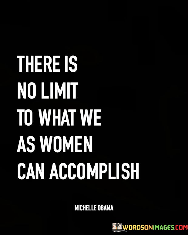 This empowering quote celebrates the boundless potential and capabilities of women. The phrase "there is no limit to what we as women can accomplish" underscores the idea that women are capable of achieving greatness and making significant contributions in any field or endeavor they choose to pursue. It challenges the historical limitations and stereotypes that have often confined women's roles and aspirations, emphasizing that women possess the same intelligence, talent, and determination as men, and they can excel in any domain they set their minds to. This quote serves as a rallying cry for gender equality, highlighting the need to break free from societal constraints and promote opportunities for women to thrive and succeed. It encourages women to dream big, embrace their ambitions, and shatter the glass ceilings that may stand in their way. It also calls upon society to recognize and support the limitless potential of women, fostering an environment where women can achieve their goals, lead with confidence, and contribute their unique perspectives to shape a more inclusive and equitable world. Ultimately, this quote inspires women to embrace their power and worth, encouraging them to seize every opportunity and pursue their passions fearlessly, knowing that their potential for success knows no bounds.