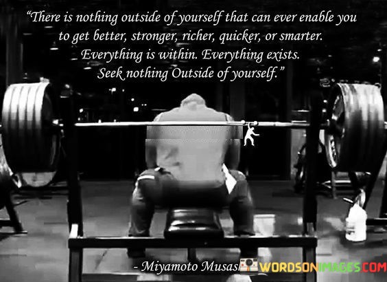 True growth originates from within. The quote implies that intrinsic qualities fuel progress. It signifies that the pursuit of betterment hinges on self-discovery. By highlighting the power of internal resources, it encourages individuals to cultivate their abilities and attributes for holistic development, advocating for self-driven transformation.