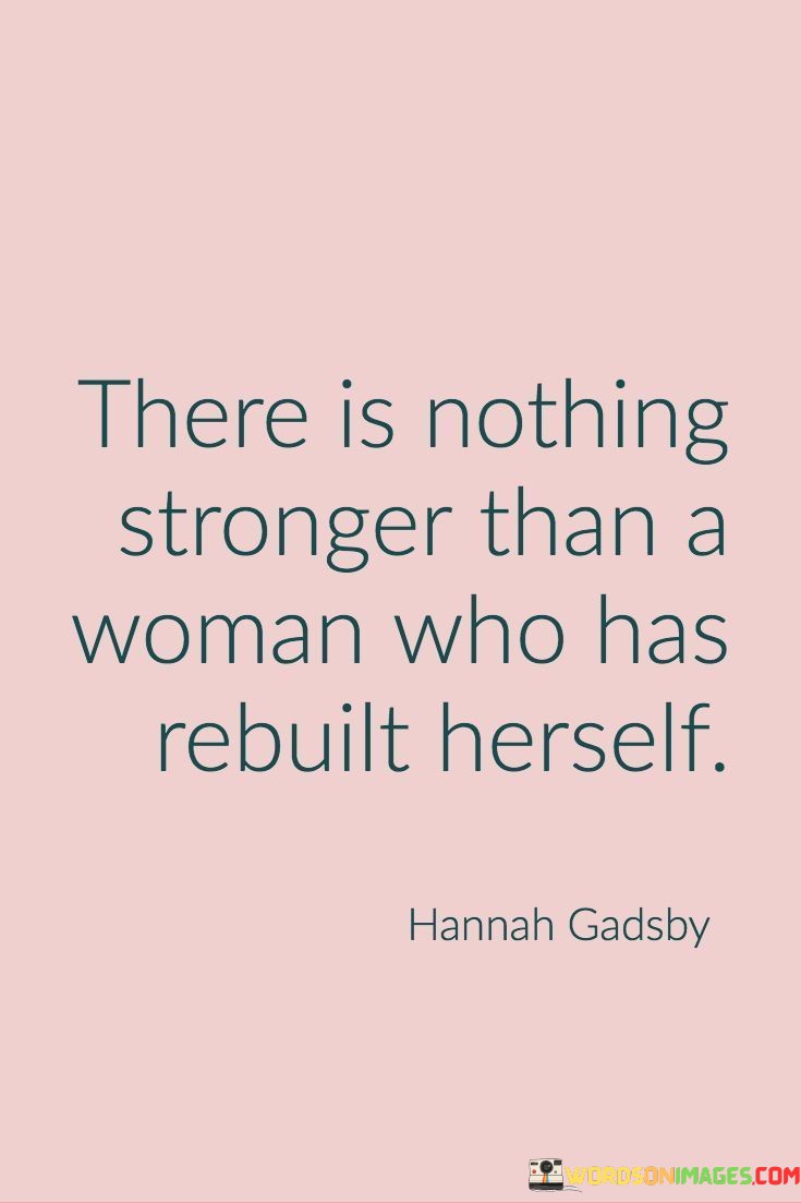 This poignant quote celebrates the resilience and strength of women who have faced adversity and rebuilt themselves from the ashes of challenging circumstances. The phrase "there is nothing stronger than a woman who has rebuilt herself" acknowledges the power and fortitude that emerge when a woman undergoes the process of rebuilding and transformation after enduring hardships or setbacks. It speaks to the extraordinary capacity of women to rise above their challenges, learning from their experiences, and using them as stepping stones to create a new and empowered version of themselves. This quote recognizes that the act of rebuilding is not simply about overcoming obstacles but also about redefining one's identity and finding newfound strength and purpose in the face of adversity. It serves as an inspiring reminder of the resilience of the human spirit and the indomitable force that women possess when they embark on a journey of self-renewal. This quote not only celebrates the strength of individual women who have rebuilt themselves but also honors the collective strength of all women who continue to rise above life's trials, emerging as beacons of hope and inspiration for others facing similar challenges. Ultimately, this quote serves as a testament to the transformative power of resilience and the enduring spirit of women who have reclaimed their power and found strength in the process of rebuilding.