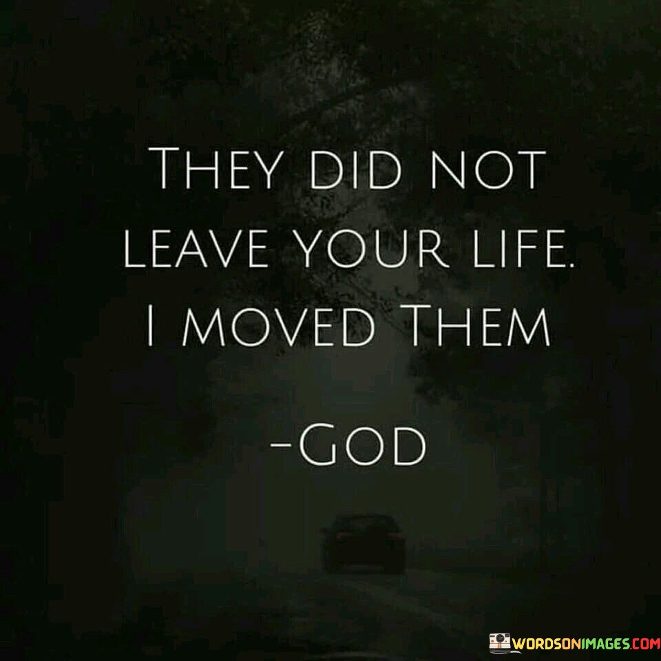 The quote "They did not leave your life; I moved them" suggests a perspective that attributes changes in one's relationships or life circumstances to a higher power or a divine force. It implies that the movement or removal of certain people or elements from one's life is not random or arbitrary but rather orchestrated by a greater purpose.