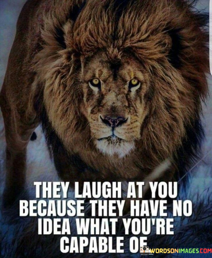The quote addresses the misconceptions and underestimations people may have about someone's abilities. It suggests that when others laugh or doubt your potential, it's often due to their lack of awareness about your true capabilities. The quote highlights the importance of self-confidence and proving doubters wrong.