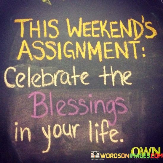 This quote encourages individuals to take time to acknowledge and celebrate the blessings in their lives as a weekend assignment. In a single sentence, it suggests that the task for the upcoming weekend is to celebrate the blessings one has.