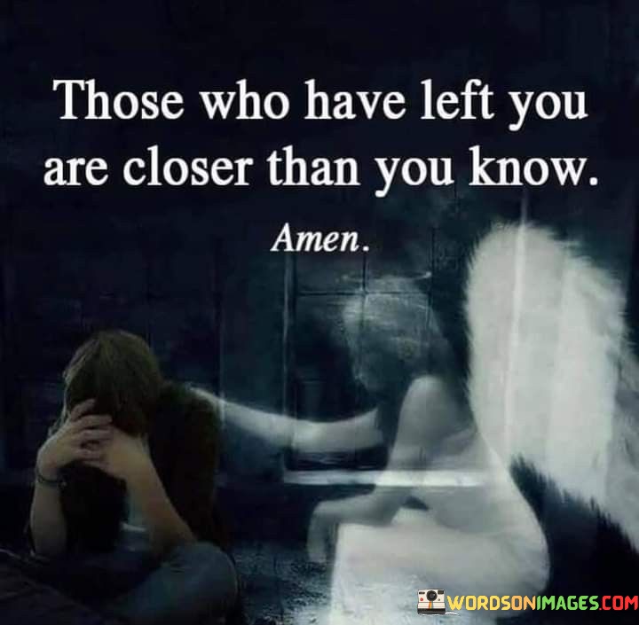 The quote underscores the enduring presence of past relationships. It reflects the emotional connection that persists beyond physical departure. "Closer than you know" emphasizes the subtle ways departed individuals continue to influence thoughts and emotions.