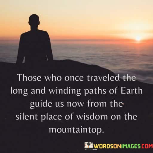 "Those who once traveled the long and winding path of Earth guide us now to the silent place of wisdom on the mountaintop" beautifully conveys the idea that those who have experienced life's challenges and gained insight now lead others towards profound wisdom.