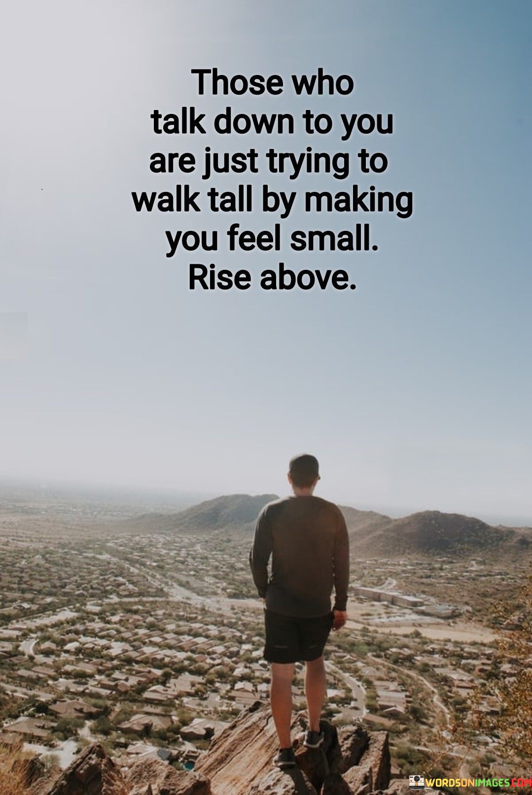 The quote offers a perspective on handling criticism. "Those who talk down to you are just trying to walk tall by making you feel small. Rise above" suggests that when others belittle you, it's often an attempt to boost their own ego, but you should overcome it by maintaining your self-confidence.