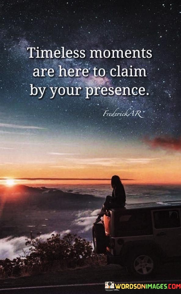 In essence, the statement captures the essence of cherishing the present. "Timeless Moments Are Here To Claim By Your Presence" encourages individuals to fully immerse themselves in the beauty of the present, allowing them to create lasting memories and meaningful connections.