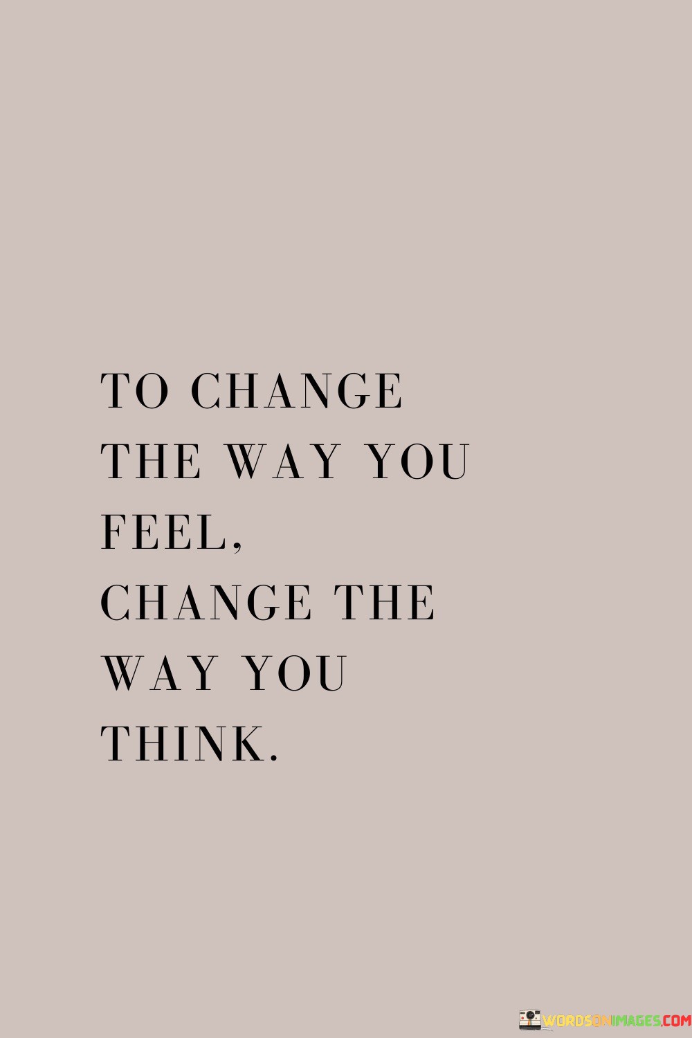 The quote, "To change the way you feel, change the way you think," conveys a profound truth about the interplay between our thoughts and emotions. It suggests that our feelings and emotions are deeply connected to our thought patterns and beliefs. When we experience negative emotions or distress, it is often a reflection of our negative or unhelpful thoughts. By changing our thought patterns and adopting more positive and constructive thinking, we can influence and transform our emotional state. The quote underscores the power of our minds in shaping our emotional experiences, and it emphasizes that we have the agency to choose how we respond to situations and events. By cultivating a mindset that embraces optimism, resilience, and self-compassion, we can elevate our emotional well-being and navigate life's challenges with greater ease and equanimity. Ultimately, the quote serves as a powerful reminder of the transformative potential of cognitive reframing and positive thinking in promoting emotional health and fostering a more fulfilling and balanced life. At its core, the quote celebrates the inseparable connection between our thoughts and emotions. Our thoughts act as a lens through which we interpret and respond to the world around us, influencing our emotional experiences. Negative or irrational thoughts can trigger feelings of anxiety, sadness, or frustration, while positive and rational thoughts can lead to emotions of joy, contentment, and resilience. Therefore, to change our emotional state, we must first address the underlying thought patterns that give rise to those feelings. Moreover, the quote speaks to the significance of cognitive reframing and self-awareness in fostering emotional well-being. By challenging negative or distorted thoughts and replacing them with more positive and rational ones, we can shift our emotional experiences in a more constructive direction. This process of cognitive restructuring empowers us to gain control over our emotional responses, reducing the impact of negative emotions and fostering a more positive and balanced outlook on life. Furthermore, the quote underscores the agency we have in shaping our emotional experiences. While we may not have control over external events, we do have the power to choose how we interpret and respond to them. By consciously choosing to focus on positive aspects, practice gratitude, and cultivate self-compassion, we can influence our emotional well-being and resilience in the face of challenges. In conclusion, the quote "To change the way you feel, change the way you think" highlights the profound connection between our thoughts and emotions. By changing our thought patterns and adopting a more positive and constructive mindset, we can transform our emotional experiences and foster a greater sense of well-being and fulfillment. The quote serves as a powerful reminder of the agency we possess in shaping our emotional responses and emphasizes the importance of cognitive reframing and self-awareness in promoting emotional health. By cultivating a mindset of positivity, resilience, and self-compassion, we empower ourselves to navigate life's challenges with greater equanimity and create a more fulfilling and balanced life. Ultimately, the quote encourages us to harness the transformative potential of our thoughts and emotions to cultivate emotional well-being and embrace a more positive and empowered approach to life.