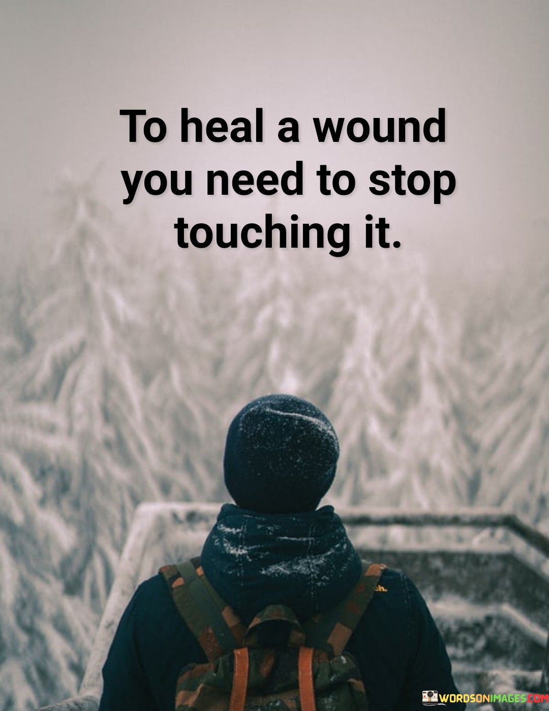 The quote "To heal a wound, you need to stop touching it" offers a profound metaphorical lesson about the process of emotional healing and moving on from painful experiences. It suggests that just as physically touching a wound can impede its recovery, constantly revisiting and dwelling on emotional wounds can hinder the healing process and perpetuate emotional pain. Emotional wounds can stem from various sources, such as heartbreak, loss, betrayal, or traumatic experiences. Just like physical wounds, these emotional wounds need time and space to heal. Continuously revisiting the painful memories or ruminating on the hurtful experiences can reopen the wounds and prevent them from closing properly. The quote emphasizes the importance of giving oneself time and distance from the source of emotional pain. It encourages individuals to detach emotionally from the hurtful situation, allowing them to gain perspective and clarity. By stepping back from the emotional wound, one can begin to process their feelings and gradually come to terms with the pain. Moreover, the quote highlights the significance of self-compassion and self-care during the healing process. It encourages individuals to treat themselves gently and kindly as they navigate the emotional journey. Engaging in self-destructive behaviors or seeking out reminders of the pain can be counterproductive, hindering the process of healing. In addition, the quote conveys the importance of seeking support and healing resources. Just as medical attention can aid physical wound recovery, emotional support from loved ones, therapy, or counseling can play a vital role in the healing process. Having a safe space to express feelings and work through emotions can promote healing and growth.