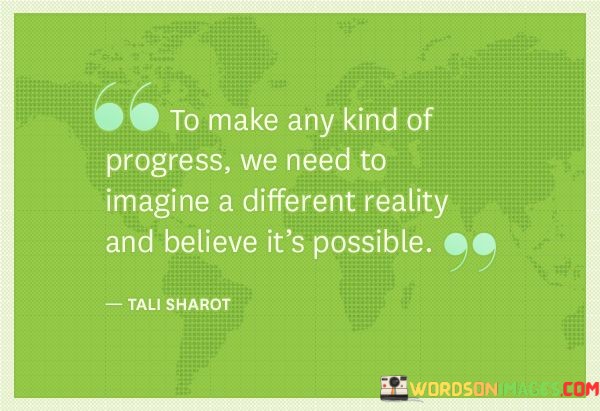 The quote "To make any kind of progress, we need to imagine a different reality and believe it's possible" underscores the significance of envisioning new possibilities and having faith in our ability to achieve them. Human progress has been driven by our capacity to imagine and dream beyond our current circumstances. From scientific discoveries to technological advancements, literature, and art, every significant development started with someone's imagination. When we envision a different reality, we allow ourselves to transcend the limitations of the present and open the door to endless opportunities. Belief plays a pivotal role in turning our imagination into reality. If we genuinely believe that the vision we hold is possible, we are more likely to take action, persist through challenges, and invest the necessary effort to bring that vision to life. It is this unwavering faith in the possibility of our dreams that fuels our determination and resilience. To make progress, we must first identify the areas in our lives or society where improvement is needed. Once we have a clear vision of the changes we want to see, we can imagine a better future, free from the constraints of the present. This imaginative process fuels our motivation and creativity, allowing us to devise innovative solutions and strategies to achieve our goals. However, imagination and belief alone are not sufficient; they must be accompanied by action. Taking proactive steps towards our envisioned reality is the bridge that transforms dreams into tangible results. Progress often requires courage, stepping out of our comfort zones, and navigating uncertainty, but it is through these endeavors that we pave the way to new and better realities. In conclusion, the quote emphasizes that progress is born from the fusion of imagination and belief. By envisioning a different reality and having unwavering faith in its possibility, we ignite the spark of progress within ourselves. Through action and perseverance, we can turn our dreams into reality and create a world that transcends the limitations of today. The power to make progress lies within us; all we need to do is harness our imagination and belief to propel us forward into a brighter future.