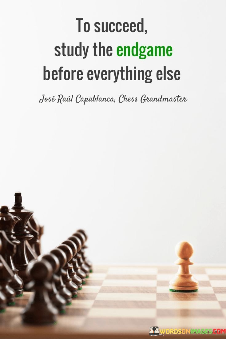 The quote highlights the significance of goal-oriented thinking. It encourages individuals to plan their actions with the final result in mind. By studying the "endgame," one can anticipate challenges and design a more effective path to success.